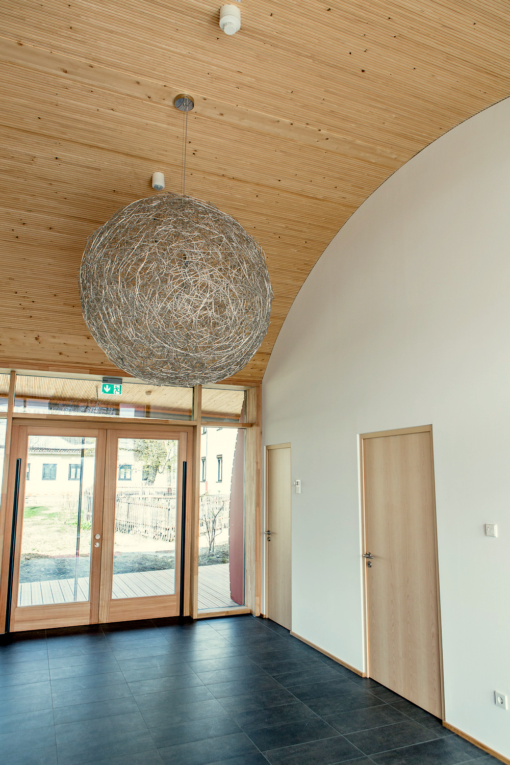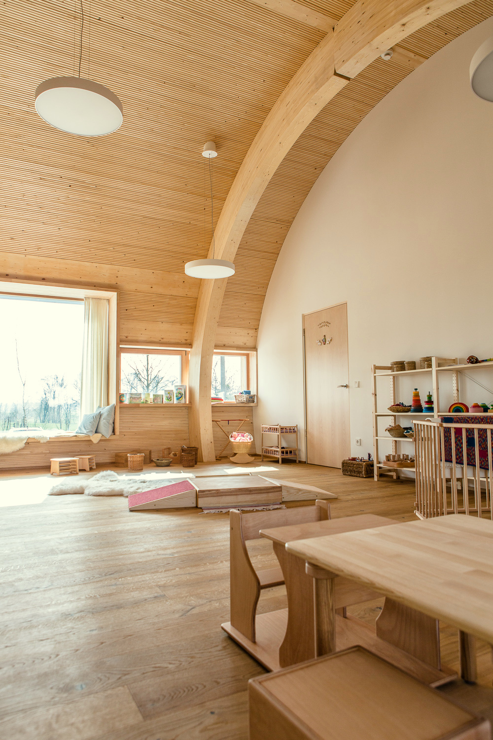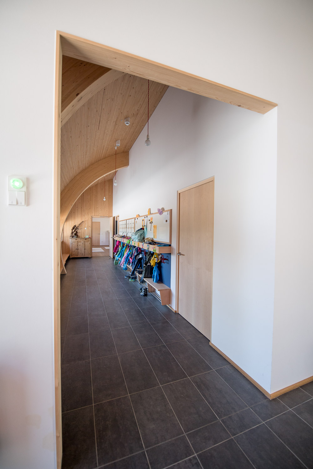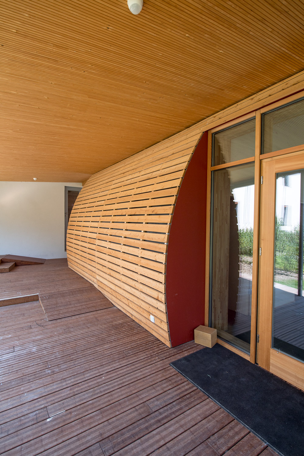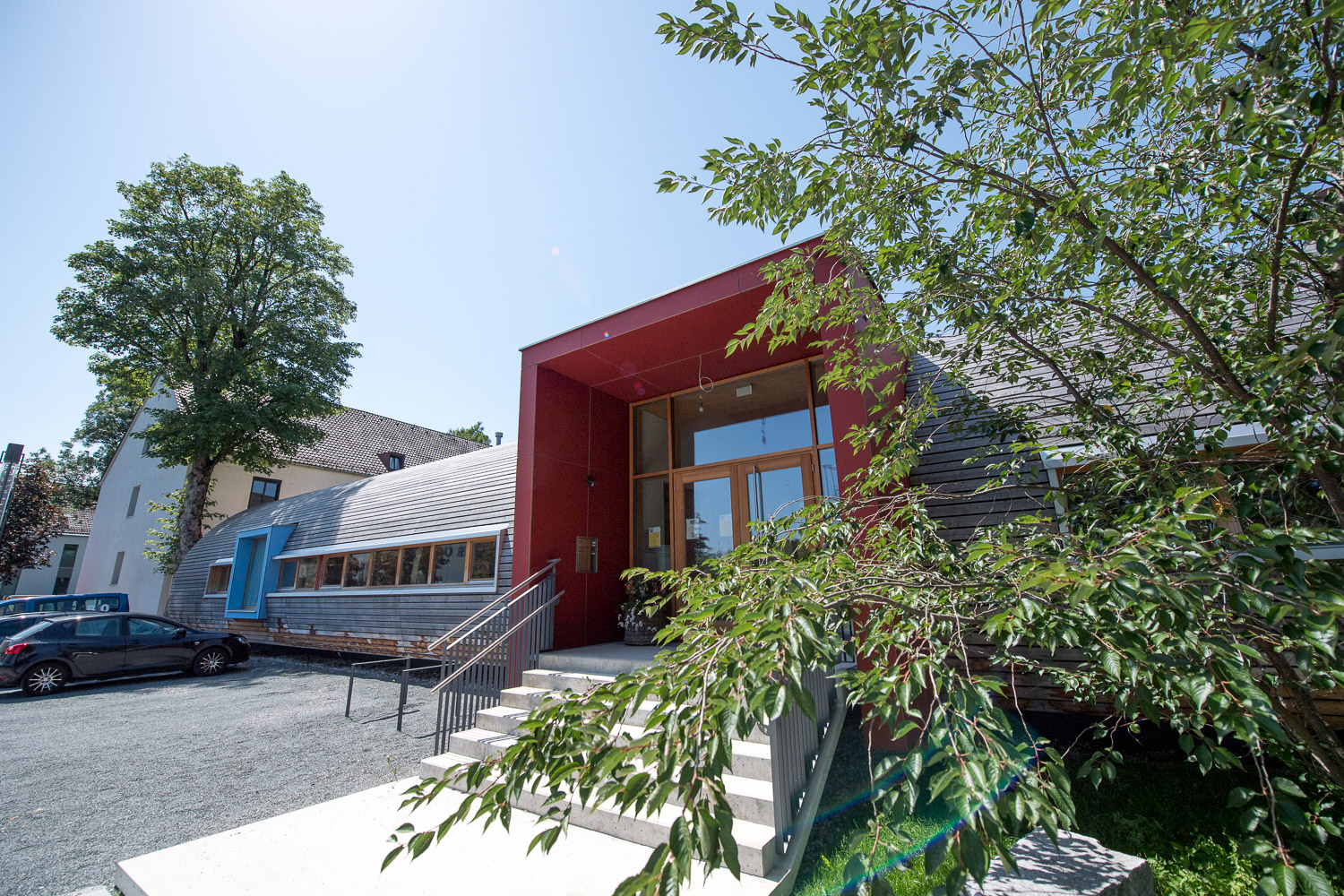 Das in ökologischer Vollholzbauweise erstellte halbrunde Gebäude mit seiner außergewöhnlichen Kubatur wurde im Dezember 2015 fertiggestellt und hat seinen Betrieb begonnen.